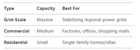 Les grands systèmes (de centaines à milliers de kWh) prennent en charge des opérations plus importantes ou une utilisation industrielle.