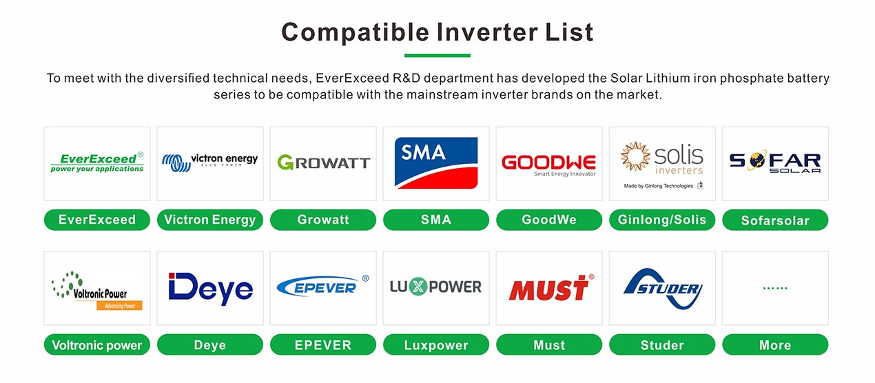 Le protocole de communication CAN/RS485/RS232 des batteries lithium-ion est compatible avec la plupart des onduleurs du marché, tels que Growatt, Deye, SunGoldPower, Luxpower, Victron Energy, Schneider, Phocos, SMK, etc.