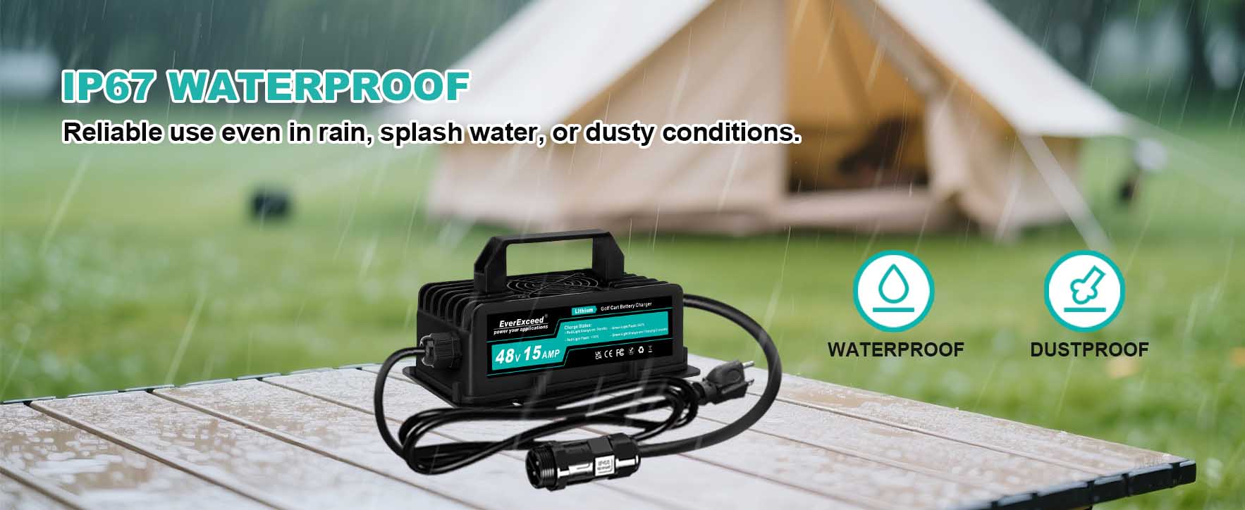 Le chargeur de batterie est entièrement étanche à la poussière et peut résister à une immersion temporaire dans l'eau, ce qui le rend idéal pour une utilisation en extérieur et dans des environnements difficiles.