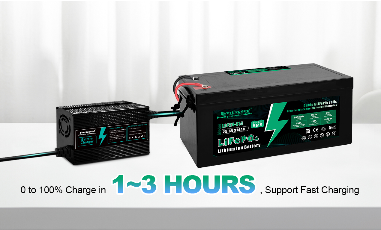 Les batteries au lithium fer phosphate EverExceed peuvent être facilement chargées complètement en très peu de temps grâce à l'acceptation de charge à grand ampères. Elle est capable d'accepter jusqu'à 1C (1 x capacité nominale) d'ampères de charge continue, ce qui permet à la batterie d'être complètement chargée en 1 à 3 heures. Cette fonctionnalité améliorera considérablement l'efficacité du service de charge.