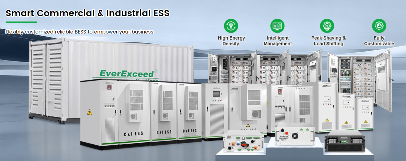 En tant que société mondiale fabricant de systèmes de stockage d'énergie avec plus de 20 ans d'expérience dans fabrication de batteries En matière d'intégration de systèmes, EverExceed fournit des systèmes de stockage d'énergie commerciaux et industriels (C&I ESS) fiables, efficaces et évolutifs pour aider les entreprises à optimiser leurs coûts d'électricité, à améliorer la fiabilité de leur alimentation électrique et à accélérer leur transition énergétique.