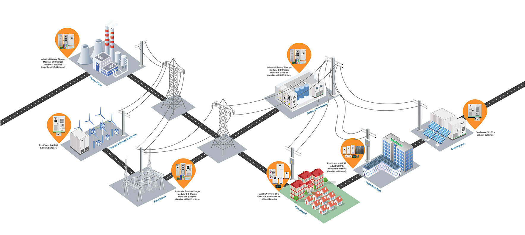 Les réseaux de transport d'électricité actuels sont confrontés à des défis sans précédent : une part croissante d'énergies renouvelables, une demande accrue, des flux de puissance fluctuants et la modernisation des systèmes existants. EverExceed accompagne les fournisseurs d'énergie, les gestionnaires de réseau et les propriétaires de réseaux grâce à une offre complète garantissant une alimentation CC stable, une alimentation CA de secours fiable, une gestion intelligente de l'énergie et des performances de stockage d'énergie optimales.