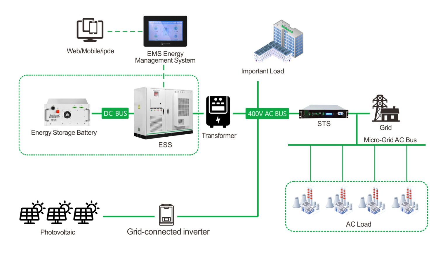 Ce projet utilise cinq ensembles de systèmes de stockage d'énergie modulaires EverPower installés en armoire extérieure. Il constitue une solution idéale pour lisser les pics de consommation et compenser les creux de consommation dans les parcs industriels à zéro émission de carbone, les ensembles résidentiels et autres applications similaires. Le système prend également en charge le couplage côté courant alternatif pour une installation flexible.