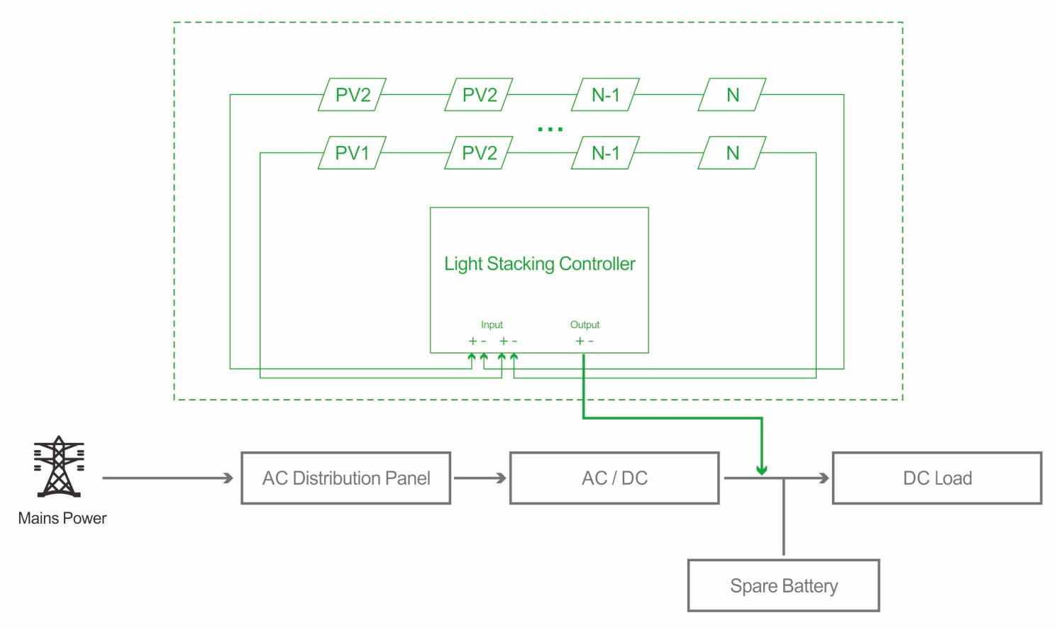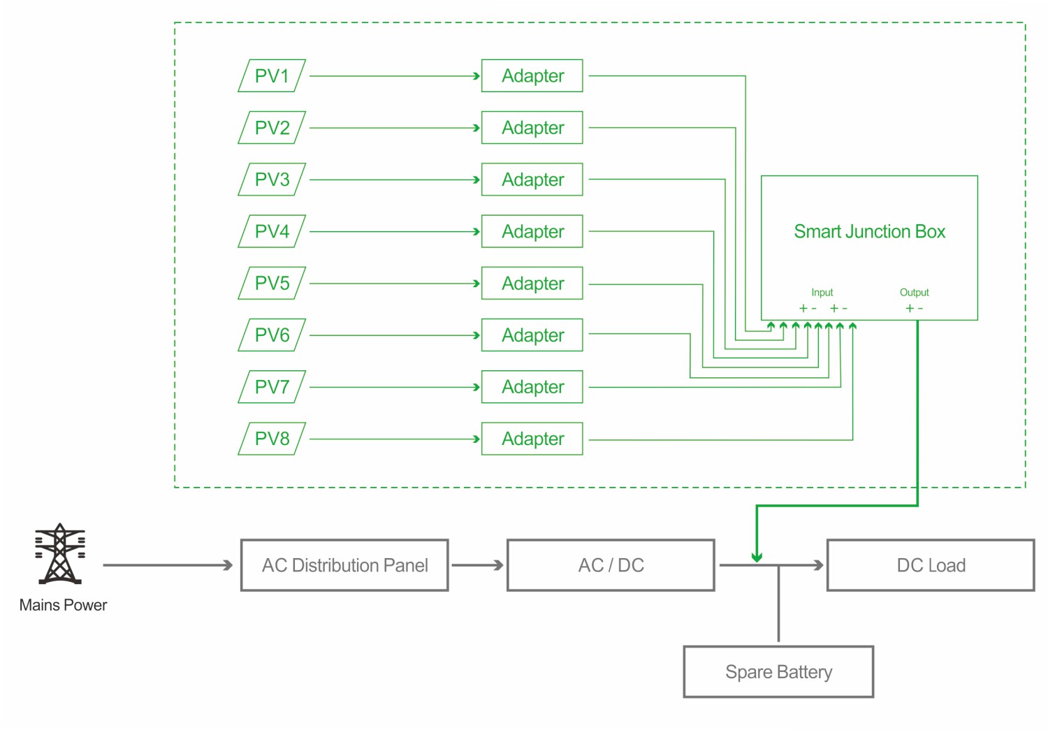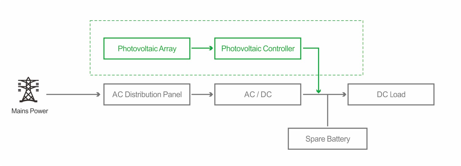 PV-Overlay intègre un système photovoltaïque supplémentaire à l'architecture électrique existante d'une station de base de télécommunications, permettant une alimentation énergétique hybride « PV + Réseau électrique ».
