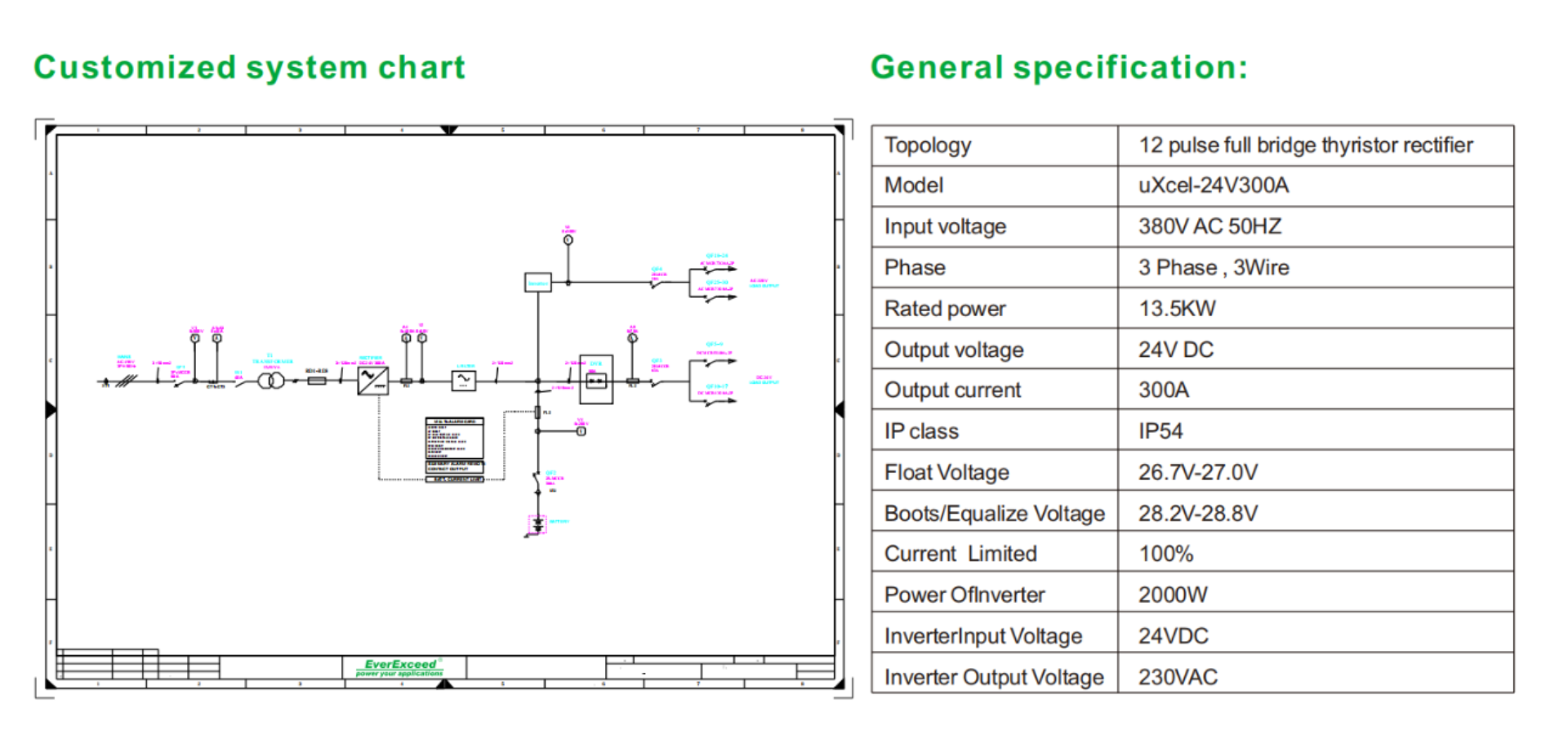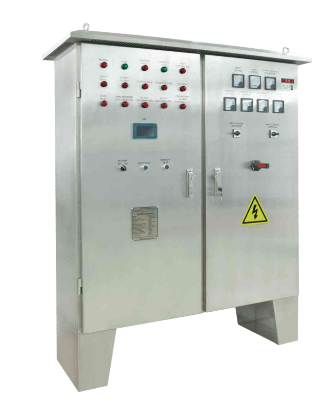2. Sûr et fiable : Deux ventilateurs de refroidissement haute puissance ont été ajoutés sur le dessus de l’armoire afin de résoudre efficacement les problèmes de refroidissement liés aux charges importantes. Le chargeur de batterie peut ainsi fonctionner normalement sous fortes charges pendant une longue période. L’onduleur a été personnalisé pour fournir une alimentation CA (230 V CA) fiable. L’alimentation CC est également personnalisée avec un convertisseur abaisseur en silicium, capable de fournir une alimentation CC fiable aux charges de précision.